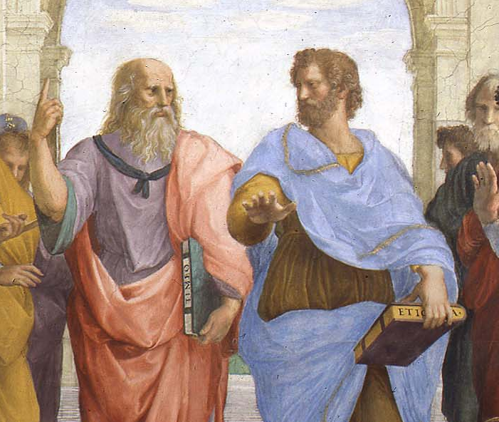 이들은 플라톤(왼쪽)과 아리스토텔레스다. 각기 이상주의와 현실주의를 대표하는 두 사람은 진리의 본질을 두고 논쟁을 벌이고 있는 듯 하다. 오른손을 들어 하늘을 가리키고 있는 플라톤은 자신의 저서 <티마이오스>를 들고 있으며 땅을 향해 손바닥을 펼치고 있는 아리스토텔레스는 <니코마코스 윤리학>을 들고 있다. 라파엘로가 플라톤의 얼굴로 그려넣은 모델은 레오나르도 다빈치다.