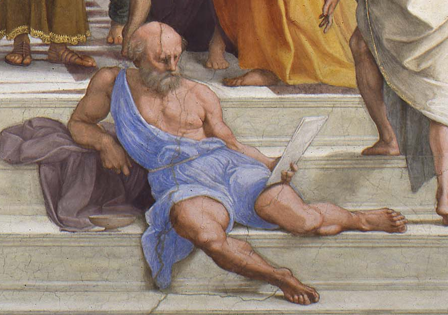 아리스토텔레스 앞에서 계단에 비스듬히 누워있다시피 한 인물은 무욕의 철학자로 불리는 디오게네스다. 그와 알렉산더 대왕의 에피소드는 유명하다. 현자가 있다는 말을 듣고 찾아온 알렉산더 대왕은 디오게네스에게 소원이 무엇이냐고 묻는다. 그러자 디오게네스는 햇빛을 가리지 말고 비켜달라고 말한다.