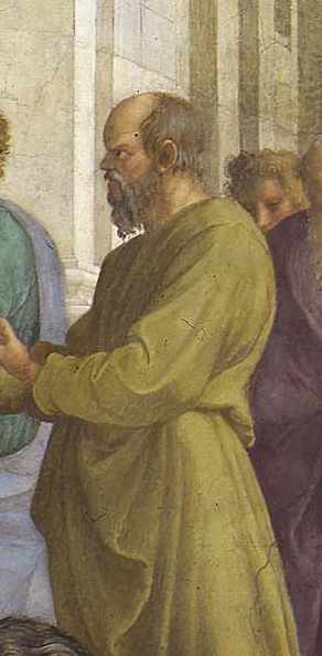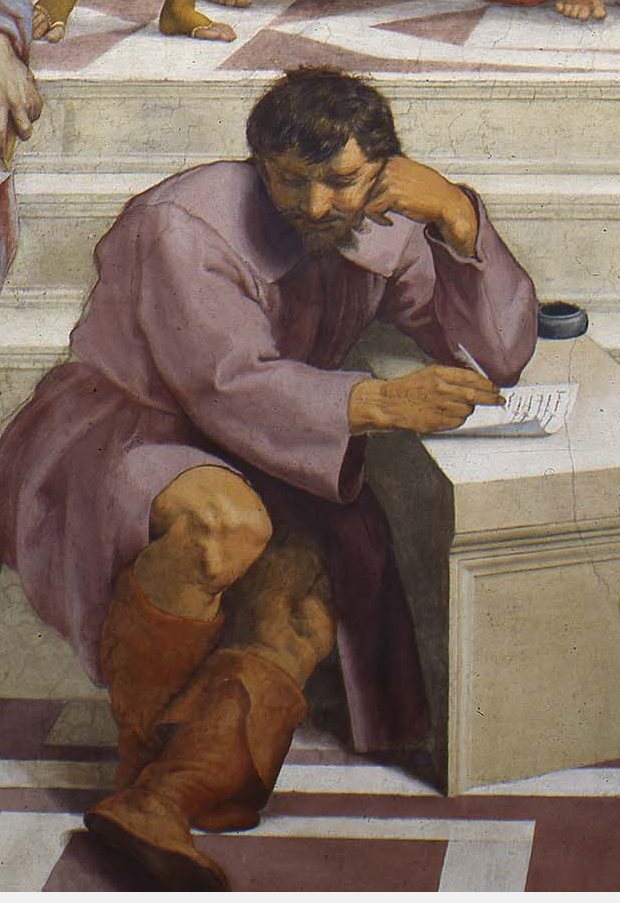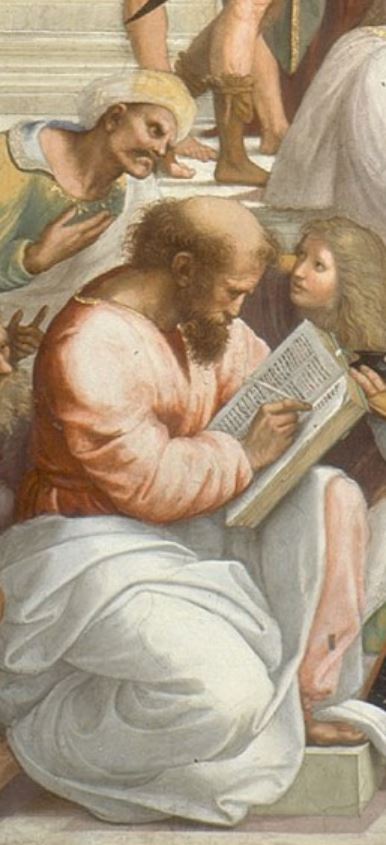 이들은 플라톤(왼쪽)과 아리스토텔레스다. 각기 이상주의와 현실주의를 대표하는 두 사람은 진리의 본질을 두고 논쟁을 벌이고 있는 듯 하다. 오른손을 들어 하늘을 가리키고 있는 플라톤은 자신의 저서 <티마이오스>를 들고 있으며 땅을 향해 손바닥을 펼치고 있는 아리스토텔레스는 <니코마코스 윤리학>을 들고 있다. 라파엘로가 플라톤의 얼굴로 그려넣은 모델은 레오나르도 다빈치다.
