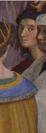 이 작품에는 그림을 그린 라파엘로도 있다. 프톨레마이오스 바로 오른쪽에 살짝 보이는 곱상한 얼굴이다. 잘 생긴 얼굴에 성격도 활발했던 라파엘로는 많은 여성과 염문을 뿌렸던 것으로도 유명하다.
