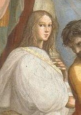 남자들만 모여있는 듯한 이 공간엔 여성이 한 명 있다. 왼쪽 가운데 흰 옷을 입고 정면을 응시하는 인물로, 로마제국 당시 이집트 알렉산드리아 출신의 자연 철학자이자 수학자인 히파티아다. 그는 뛰어난 학문적 역량과 업적을 보였으나 광적인 기독교도들에 의해 ‘사교’ ‘이단’으로 몰리면서 처참한 죽음을 맞았다. 교황청에선 이교도를 그리는 것은 용납할 수 없다고 했지만 라파엘로는 그렇다면 그림을 포기하겠다고 맞섬으로써 이 작품을 완성할 수 있었다.