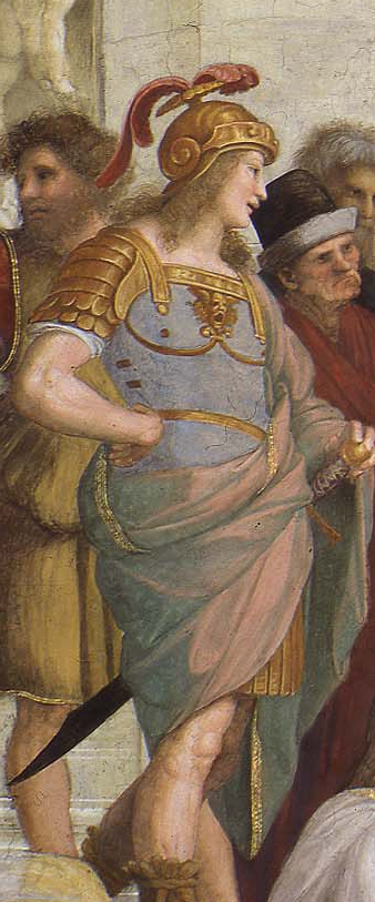 이 그림에는 알렉산더 대왕도 등장한다. 왼쪽 상단에 투구를 쓰고 갑옷을 입은 이다. 알렉산더 대왕을 향해 무언가를 설파하는, 머리가 벗겨진 인사는 소크라테스, 그림 가운데 아래쪽에 턱을 괴고 생각에 빠진 사람은 만물의 기원을 불로 여긴 헤라클레이토스다. 라파엘로는 헤라클레이토스의 얼굴을 미켈란젤로를 모델 삼아 그렸다.