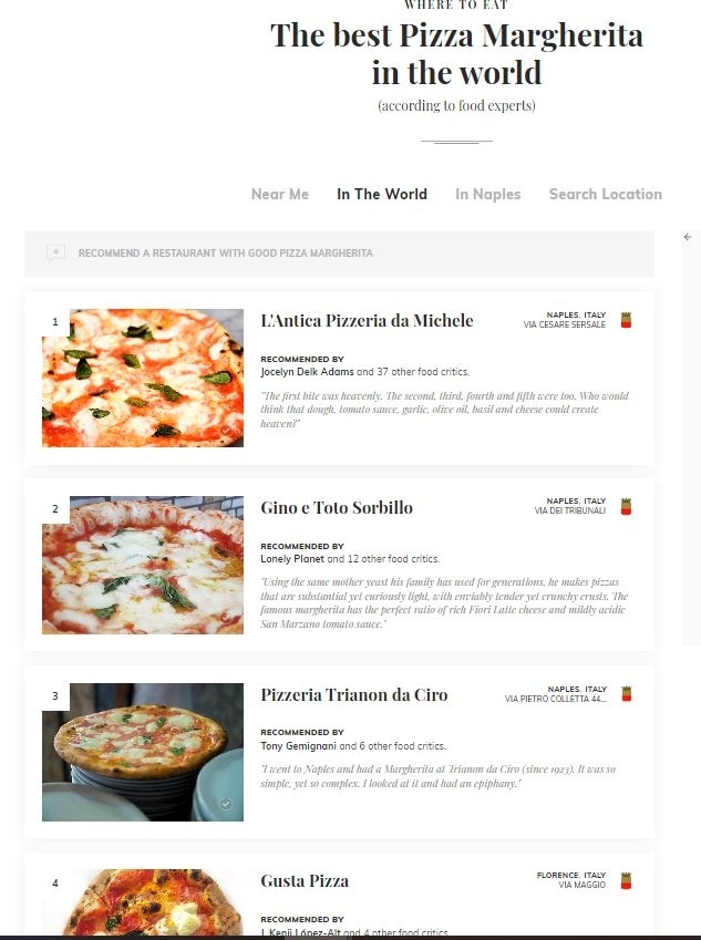 그 중 원조로 여겨지는 마르게리타 피자(Pizza Margherita)를 클릭해 보면 유래와 재료, 레시피에 관한 설명과 함께 정통 마르게리타 피자를 맛볼 수 있는 최고의 식당들(The best Pizza Margherita in the world)이 순서대로 정렬되어 있다.