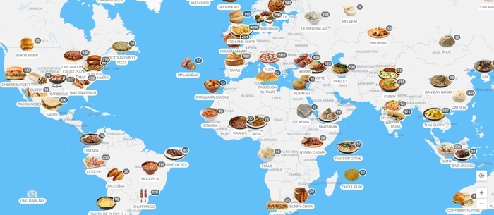 구체적인 음식 이름을 입력하는 대신, 방문하고자 하는 지역의 지도 위에 표기된 인포그래픽을 클릭해도 된다. 검색창 아래에 있는 ‘EXPLORE MAP’을 클릭하면 세계지도가 펼쳐진다.