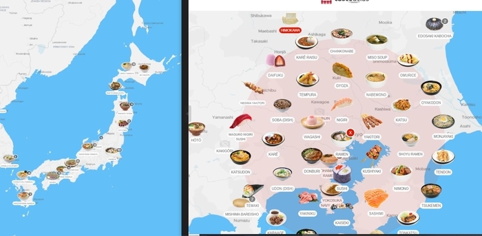 지도상에서 일본으로 가보자. 일본 지도 위에 표시된 음식 그래픽 옆의 숫자나 이름을 클릭하면 원하는 음식 정보를 찾아갈 수 있다.