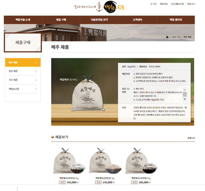 대구 샬트르 성바오로 수녀회가 운영하는 백합식품은 메주와 된장을 만들어 판매한다. 대구 일대에서는 ‘수녀원 메주’로 유명하다. 수녀원 내에 보육 시설을 운영하면서 이를 지원하는 사업의 일환으로 시작하게 됐다. 이곳에서 판매하는 제품은 메주와 된장, 쌈장, 고추장, 간장 등 장류, 메줏가루와 청국장 등으로, 엄선된 국내산 콩만을 사용해 만든다. 메주는 개량된 형태로 색다른 모양을 갖고 있는 것이 특징이다. 일반적인 메주는 큰 덩어리 형태이나 백합식품 메주는 우동 면발같은 메주가 주먹만 한 덩어리로 뭉쳐져 있다. 발효가 잘되어 장맛이 좋고 장을 담기도 편리하다는 것이 소비자들의 반응이다. 올해 처음으로 장 담그기를 시도했다는 직장인 유은경씨는 “대구가 외가라 어릴 때부터 외할머니와 어머니가 이 수녀원에서 사온 메주로 담근 장을 먹었지만 외할머니가 돌아가신 후로는 몇 년간 못 먹었다”면서 “군내나 잡내도 없고 만드는 것도 생각만큼 어렵지 않았다”고 말했다. 제품은 인터넷 홈페이지(www.spcfood.co.kr)를 통해 구입할 수 있다. 판매에 따른 수익금은 수녀원 산하 여러 복지시설을 지원하는 데 사용된다.