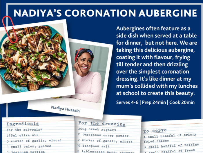 나디야 후세인의 대관식 가지 레시피. 공식 홈페이지에서 다운받을 수 있다. 출처 https://coronation.gov.uk/