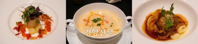 아스파라거스 디너에 나온 샐러드, 수프, 라비올리(왼쪽부터)