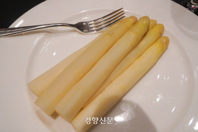 의문은 곧 풀렸다. 이날 식탁에 오른 아스파라거스는 한국에서 흔히 볼 수 있는 아스파라거스의 모습과는 사뭇 달랐다. 마치 양초처럼 두껍고 길쭉한 모양이었다. 색깔은 녹색이 아닌 노르스름한 빛이 도는 흰색이다. 독일인에게 전형적인 아스파라거스는 바로 이 ‘화이트 아스파라거스’다. 흰색 때문에 ‘하얀 금’, ‘식용 상아’로도 불리는 화이트 아스파라거스는 독일에서도 귀하게 취급받는 식재료다. 안톤 숄츠 기자는 “한국에서는 쉽게 찾을 수 없는 채소이다 보니 매년 이맘때가 되면 독일 사람들은 아스파라거스를 많이 그리워한다”고 설명했다. 국내에서 수급이 쉽지 않은지라 한독상공회의소는 이번 디너를 위해 독일 라인란트 지역 농장에서 200㎏의 아스파라거스를 공수해왔다.