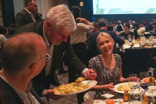 미하엘 라이펜슈툴 주한 독일대사(가운데)가 아스파라거스에 곁들일 감자를 덜어주고 있다.