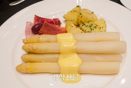 화이트 아스파라거스는 햄과 감자를 곁들여 홀란다이즈 소스를 뿌려 먹는다