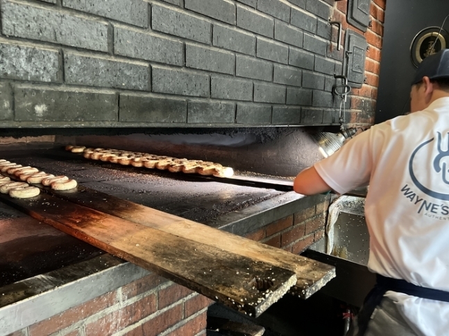 웨인스 베이글 강남점에서 화덕에 베이글을 굽고 있는 모습
