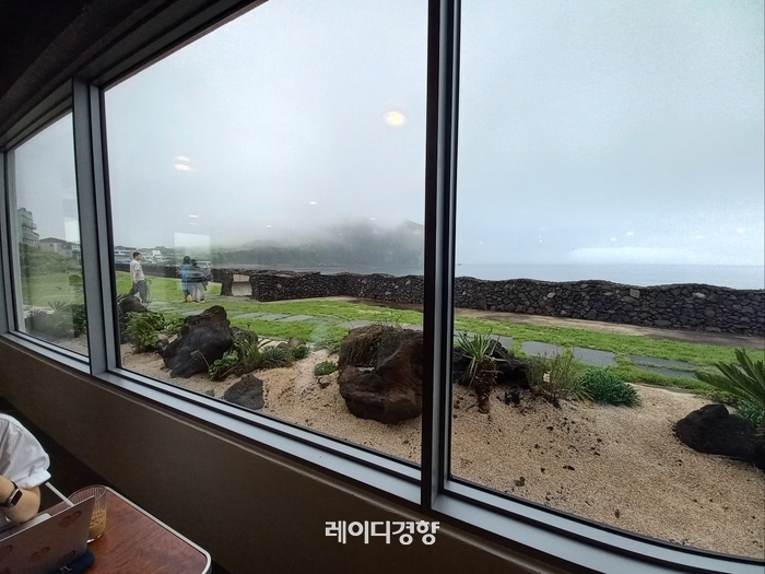 프릳츠 제주 성산점에서 창밖을 바라본 모습. 비가 오고 안개가 짙어 성산일출봉이 흐릿하게 보인다. 맑은 날에는 눈앞에서 성산일출봉을 감상할 수 있다.