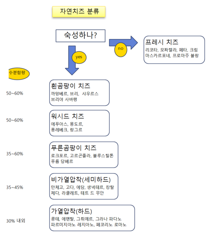 복잡한 것은 자연치즈의 세계다. 자연치즈는 수분함량과 숙성법에 따라 크게 6가지로 나눌 수 있다. 프레시치즈(생치즈), 흰곰팡이치즈, 워시드치즈, 푸른곰팡이치즈, 비가열압착치즈(세미하드), 가열압착치즈(하드)다. 이 중에서 프레시치즈는 원유를 굳힌 뒤 숙성 과정을 거치지 않고 바로 먹는 치즈를 말한다. 수분함량이 높고 부드러우면서 순한 맛이 특징이다. 다른 치즈들은 일정 기간 숙성과정을 거친다. 숙성을 거치면서 치즈는 고유의 맛과 질감, 향기를 갖는다. 흰곰팡이를 발라 숙성시키는 흰곰팡이 치즈, 소금물이나 알코올로 외피를 씻으며 숙성시키는 워시드치즈는 부드러운 질감을 갖고 있다. 푸른곰팡이 치즈는 치즈에 푸른곰팡이를 주입시켜 숙성시키는 것으로, 톡 쏘는 향을 가진 것이 특징이다. 비가열압착치즈나 가열압착치즈는 연질 치즈에 비해 오랜 기간 숙성과정을 거쳐 수분이 적고 단단하다.