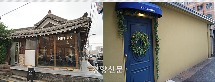 미미옥과 연결되는 바로 옆 건물에는 수제버거 전문점 ‘버거보이’가 자리 잡고 있다. 캠핑장을 구현해 놓은 듯한 인테리어의 버거보이는 캠핑장에서 즐기는 버거를 콘셉트로 한 버거 전문점이다. 투박한 야생성이 느껴지는 매장 분위기와 클래식한 버거 맛이 재미있는 조화를 이루는 곳이다. 미미옥 맞은 편 골목 안쪽으로는 화사한 레몬빛 담벼락이 시선을 끈다. 벽을 따라 들어가면 만나게 되는, 리스 장식이 된 진청색 문은 이국적인 분위기를 물씬 풍긴다. 이탈리안 레스토랑 쇼니노다. 문을 열고 들어서는 순간 싱그러운 레몬향이 맞이하는 매장은 순식간에 이탈리아 바닷가의 어느 레스토랑으로 이동한 것 같은 느낌을 준다. 큼직한 테이블을 놓아 일행이 아닌 사람들과도 함께 식사하는 것이 어색하지 않은 이곳에선 접시 하나, 무심한 듯 올려놓은 소품 하나에서도 이국적 에너지가 느껴진다.