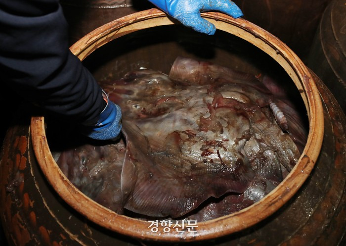 집집마다 나름의 홍어 삭히는 비법이 있었고 대소사에 빠지지 않는 음식. 큰일을 치를 때면 반드시 상에 올라야 하는 홍어는 전라도 음식문화의 중심이고 정수다. 2대째를 이어오는 영산포홍어 김영수 대표는 황토를 이용한 숙성실에서 홍어를 숙성시킨다. 숙성실 문을 여니 응축된 암모니아 냄새가 눈까지 찔러온다. 성인 남성 허리까지 올라오는 10여개의 큼직한 항아리 안에는 홍어가 담겨 있다. 김 대표는 항아리 위의 두툼한 짚을 들추고 한 마리를 꺼냈다. 날개를 펼친 모양이 상반신을 가릴 만큼 크다. 숙성실은 연중 2~3도를 유지하는데, 홍어의 크기나 계절에 따라 숙성기간에는 조금씩 차이가 있다고 한다. “지금은 냉장 시설이 발달하면서 연중 홍어를 먹지만 예전엔 찬 바람 불 때 주로 홍어를 먹었어요. 겨울에 홍어 살이 짠득짠득하니 제일 찰지거든.”