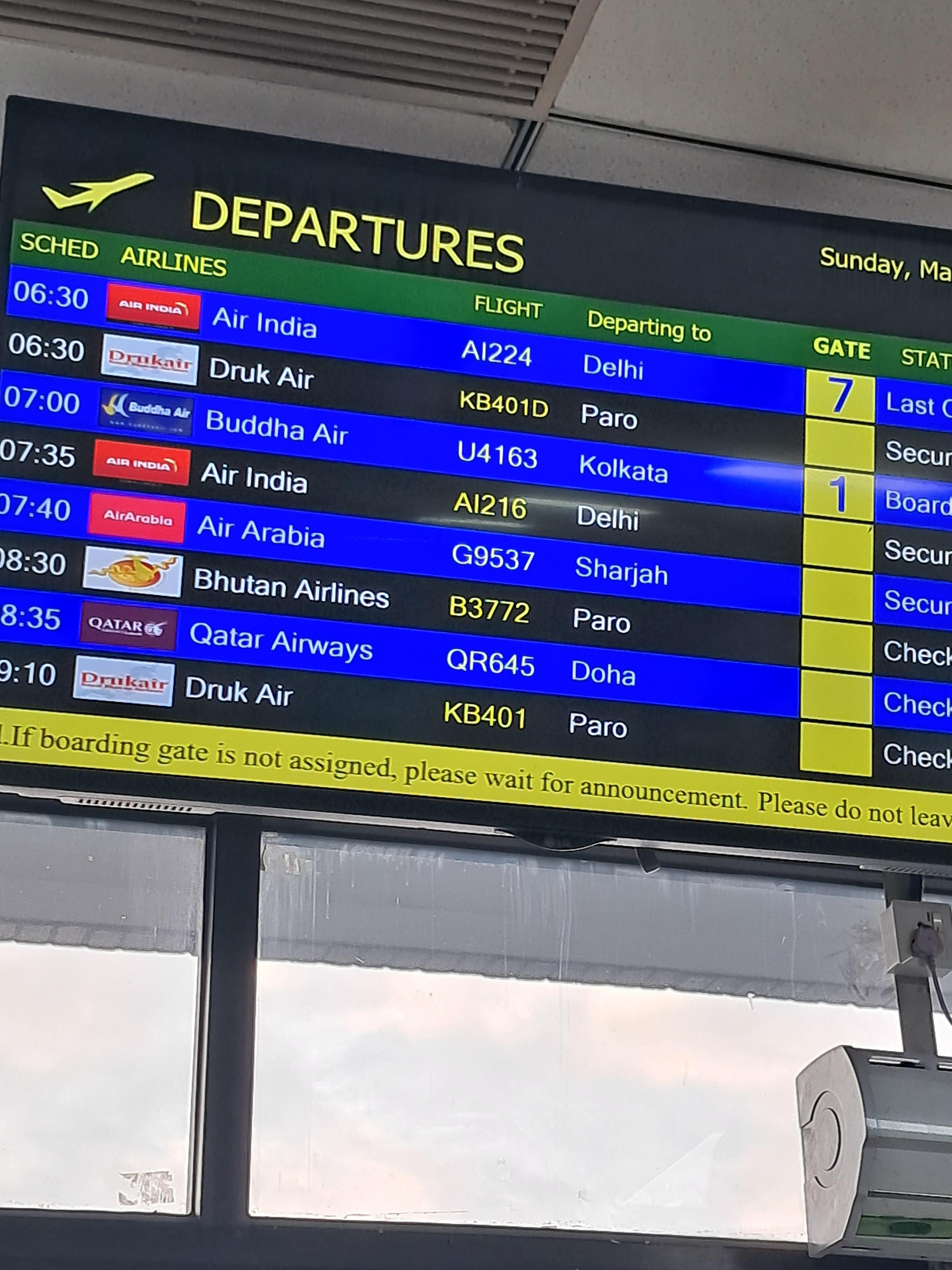 네팔 공항 출국장에 파로행으로 표시된 Druk Air 그리고 Bhutan Airlines 두 항공사가 보인다.